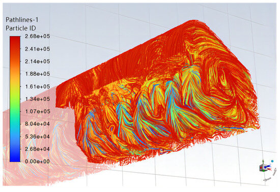 After the calculation is completed, Fluent is used to draw the pathlines in the crushing chamber of the straw-crushing device, which represents the trajectory curve of the fluid particle flow in continuous time. The pathlines can be used to observe the airflow movement law in the crushing chamber. The drawing results are shown in Figure 6.