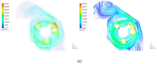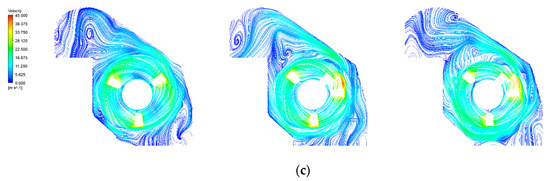 Streamline diagram of different cutter shaft speeds of P1~P3. (a) P1 cross-section streamline diagram. (b) P2 cross-section streamline diagram. (c) P3 cross-section streamline diagram.