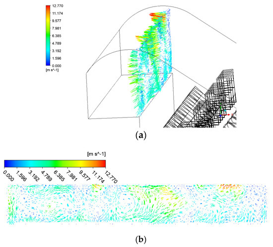 Velocity vector diagram of P5. (a) P5 velocity vector direction. (b) P5 sectional velocity vector diagram front view.