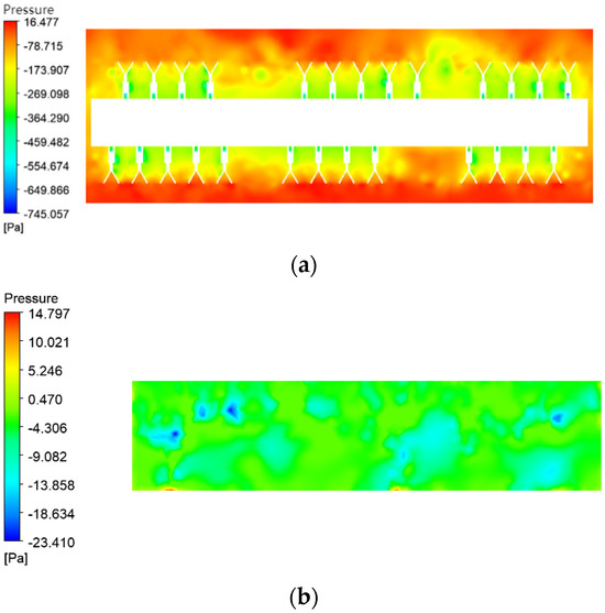 Pressure analysis diagram. (a) P4 sectional pressure cloud diagram. (b) Air inlet pressure cloud diagram.