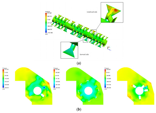 Figure 11a is the surface pressure cloud diagram of the cutter shaft in the crushing chamber, and Figure 11b is the pressure cloud diagram of the P1~P3 sections. Combined with the two figures, it can be seen that under the working condition of the machine, the high-pressure area in the crushing chamber is concentrated at the end of the blade cutter; the pressure on the windward side of the wind knife is larger than that of the surrounding area, and a small high-pressure area appears. The pressure on the leeward side of the wind knife is smaller than that of the surrounding area, and an area with higher negative pressure appears. At the same time, it can be seen from Figure 11b that the pressure distribution in the crushing chamber increases radially along the rotation center of the crushing cutter shaft, and in addition to the end of the flail cutter, there is also a relatively high-pressure area at the broken line of the upper shell and the lower shell of the machine, indicating that the sharp change of the inner-wall shape can easily cause a sudden change in air pressure.