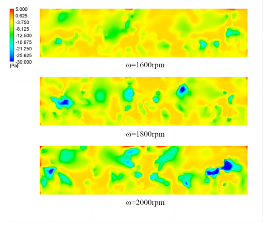 The size of the negative pressure at the inlet determines whether the straw is fed, and some surface impurities can be sucked in smoothly. As shown in Figure 12, the pressure distribution at the inlet of the flow field in the crushing chamber at three different speeds is shown respectively. The pressure cloud diagram at different speeds shows a very small part of the positive pressure area, and it is concentrated in the near-wall area near the shell of the machine, and the rest is the negative-pressure area. The higher the speed is, the larger the area of the relatively high negative-pressure area is. At a speed of 1600 rpm, the maximum negative pressure at the inlet surface of the flow field is 23.4 Pa, while at the speeds of 1800 rpm and 2000 rpm, it reaches 42.54 Pa and 63.6 Pa, respectively, which is 91% and 169% higher than that at the speed of 1600 rpm.