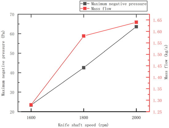 Maximum negative pressure and mass flow rate at the inlet of the flow field in the crushing chamber at different cutter shaft speeds.