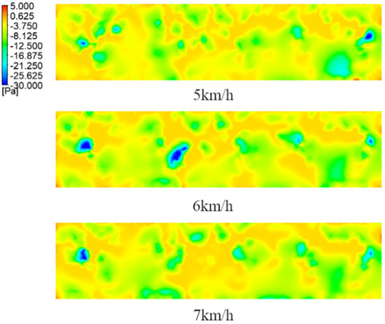 Pressure nephogram at the inlet of the flow field in the crushing chamber at different forward speeds.