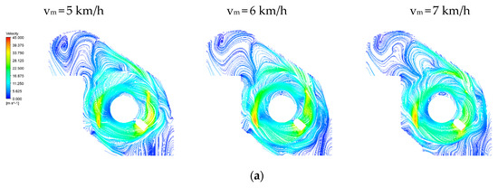 Figure 16 is the streamline diagram of P1, P2 and P3 at different forward speeds. Figure 16a shows the P1 section; when the forward speed is 5 km/h, there is a complex eddy current in the upper part of the material groove of the screw conveying device, and with the increase in the forward speed, the fluidity here has not been significantly improved. In Figure 16b, there is a large eddy current above the outlet of the flow field in the P2 section at three different forward speeds, and the area of the eddy current increases slightly with the increase in the forward speed of the machine. The eddy current here will disturb the backward throwing performance of the broken stalk. Figure 16c shows that at the cross-section of P3, the streamlines above the feed slot are very disordered at three forward speeds, which seriously affects the throwing performance of the broken stalk to the feed slot.