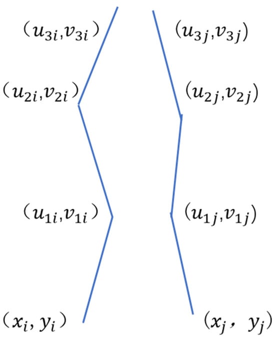 In Figure 1, x i , y i and x j , y j are the starting sites of the ith and jth beekeepers, respectively, in a year; u 1 i , v 1 i   a n d   u 1 j , v 1 j refer to their first, second, and third migratory sites, respectively. From x i , y i to u 3 i , v 3 i is the migratory flow of the ith beekeeper, and x j , y j to u 3 j , v 3 j is the migratory path flow of the jth beekeeper.