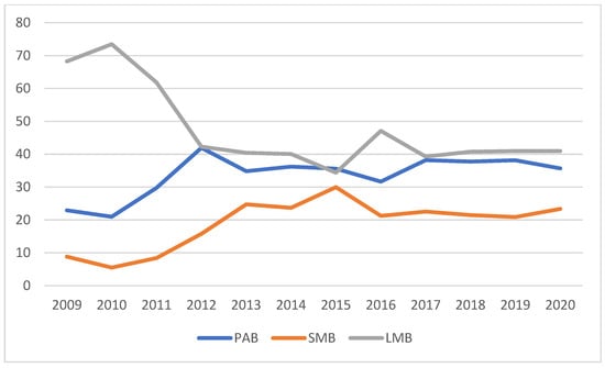 The distribution of changes in various beekeeping models in different years from 2009 to 2020 was calculated; that is, the ratio of the number of households with different beekeeping methods to the number of statistical households in each year was calculated. The results are shown in Figure 2. Beekeeping methods have changed significantly from 2009 to 2020. The LMB method showed an obvious downward trend, PAB and SMB showed an upward trend, and PAB and SMB showed a nearly parallel trend. In general, from the perspective of proportions, LMB > PAB > SMB.