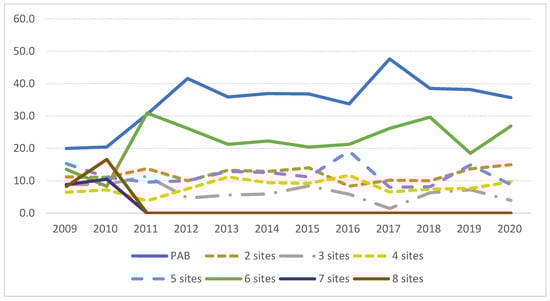 The number and trends of honey source sites visited by beekeepers annually from 2009 to 2020 are shown in Figure 3. Notably, PAB showed a clear upward trend, and the number of beekeepers visiting the six honey source points was also on the rise, whereas the other types showed decreasing trends.