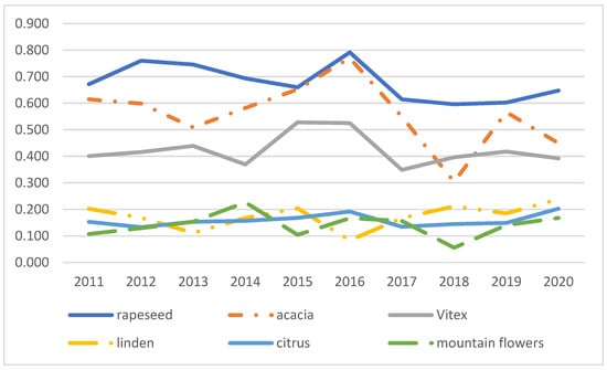 The annual frequency of honey collection from the main nectar source plants from 2011 to 2020 was calculated and is shown in Figure 4. The nectar collection frequency of the three main nectar source plants, rapeseed (Brassica campestris), acacia (Robinia pseudoacacia), and vitex (Vitex negundo), showed a downward trend, with acacia showing the largest fluctuation, whereas linden (Tilia tuan Szyszyl), citrus (Citrus reticulata), mountain flowers, and miscellaneous flowers showed a weak increasing trend.