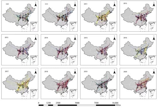 (2) GIS visualization of migratory locations and paths: From 2009 to 2020, we drew a path map of beekeepers’ migration for each year using GIS and visually viewed the annual change characteristics of beekeepers’ migration.
