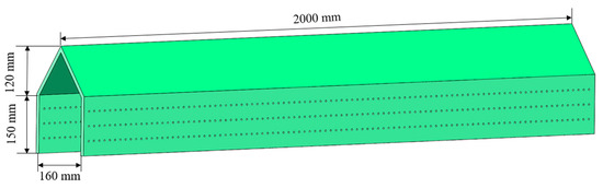 The design of the corner tube is based on the Danish CIMBRIA and Swedish SVEGMA manuals, which cover machine type and drying technology [28]. The design of corner boxes adheres to the principle that relates wind pressure and medium flow rate. The corner box has a length of 2000 mm, a width c of 160 mm, a height a of 150 mm, and a height b of 120 mm, as shown in Figure 3b, drawing on the design concept of an air distribution board in a fluidized bed dryer. The open-hole corner box is designed with the principle of negative pressure microporous air supply. The formula for calculating the opening rate of the corner tube in the vertical box dryer is as follows:
