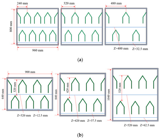 In order to address the problems of clogging and uneven heating of tiger nuts in the drying chamber of the drying tower, the horizontal and vertical spacing of the corner boxes in the drying chamber are designed by optimizing the design. This improves the movement, heat condition, and airfield distribution of tiger nut particles inside the drying chamber of the drying tower. From the literature [29], it is known that the horizontal spacing of the corner box in the drying tower chamber ranges from 200 to 500 mm, and the vertical spacing ranges from 290 to 550 mm. Considering the size of the drying tower chamber and the sizes of the tiger nuts on the corner box spacing design, spacings of 240 mm, 320 mm, and 480 mm are selected for the lateral simulation tests of the drying tower chamber, and 320 mm, 420 mm, and 520 mm are selected as the three vertical levels. In order to reduce the number of coupled simulation calculations, the length of the drying chamber is determined to be 960 mm, and the height is 800 mm when studying the impact of horizontal spacing. When studying the effect of vertical spacing, the length of the drying chamber is determined to be 900 mm, and the height values are determined to be 640, 840, and 1040 mm, respectively, as shown in Figure 5.