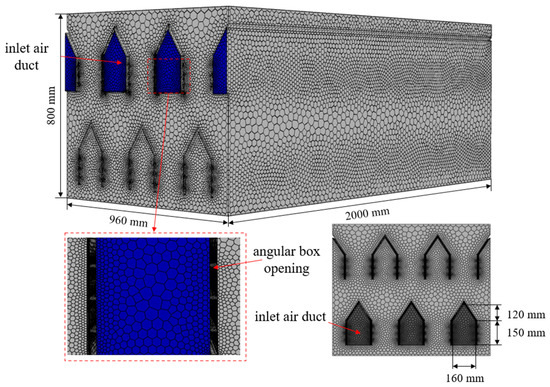 In order to verify the simulation results of the temperature field and wind field inside the drying chamber, the K-type thermocouple sensor and the hot-wire air velocity sensor were fixed on the bottom surface of the inlet corner box (Z = 400 m), and the bottom surface of the outlet corner box (Z = 32.5 mm), respectively. As shown in Figure 5, the blue part shows the locations of 98 sampling points, including 49 monitoring points below the air inlet and 49 monitoring points below the air outlet.