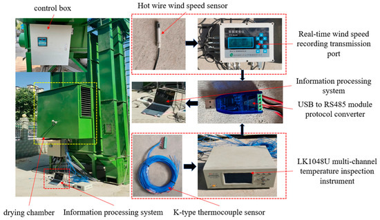 In order to verify the accuracy of the simulation, drying experiments were conducted using the experimental platform shown in Figure 7. The experimental equipment consisted of four parts, i.e., a mixed-flow dryer, an airflow velocity measurement system, a temperature acquisition system, and an information processing system.