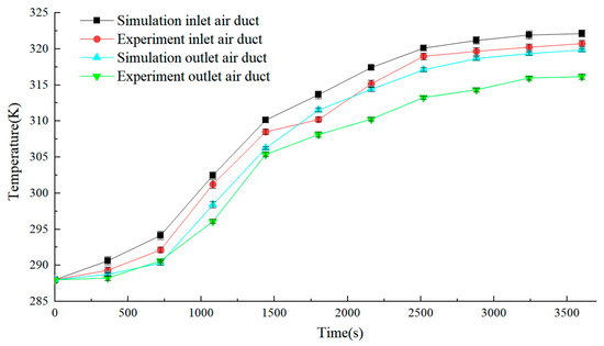 In order to determine the accuracy of the fluid model, the average temperatures of 49 monitoring points below the air inlet and 49 monitoring points below the air outlet were calculated, as shown in Figure 8, for the average temperature of the monitoring points over time, similar to the hot air temperature variation curve in reference [13]. In order to compare the differences between the simulation and experimental results, an analysis of variance (ANOVA) was performed on the temperatures at the monitoring points below the air inlet and outlet. ANOVA is used as a test of significance for the difference between the means of two or more samples. It is used to determine the magnitude of the influence of controllable factors on the results of the study by analyzing the magnitude of the contribution of different sources of variation to the total variation of the study [35]. The results are shown in Table 4 and Table 5. The results show that the simulated mean values of the monitoring points inside the drying chamber are all greater than the experimental mean values. This is because the simulation of the drying chamber box was simplified and set as an adiabatic wall, and the interference of external environmental changes was ignored, so the error occurred. However, the trend in the simulation results is consistent with the experimental results. The ANOVA results show that there is no statistically significant difference between the experimental and simulated results (p > 0.01), as shown in Table 4 and Table 5.