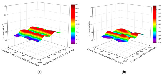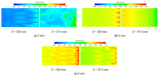 Figure 17 shows the wind field distribution at different wind speeds. From the figure, it can be seen that with the inlet wind speed increase, the wind speed inside the drying chamber gradually increases, but the uniformity of the wind field first increases and then decreases. Reference [31] reaches similar conclusions in the experimental part. When the wind speed is 2 m/s, the wind field distribution map in the middle position of the flow field line distribution is messy, resulting in the formation of a large vortex area, with large differences in wind speed at different positions. When the wind speed is 4 m/s, the wind speed distribution is uniform, and the wind speed difference between each part is small. When the wind speed is 6 m/s, the wind speed in the drying room near the air outlet side is greater than the air inlet side. This is mainly due to the airflow in the corner of the box moving in a straight line without any obstacles caused by the air volume being gathered in the second half of the duct.