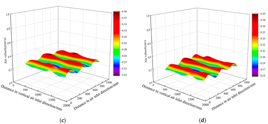 Wind speed distribution in drying room; (a) simulated wind speed distribution at air inlet; (b) wind speed distribution at air inlet test; (c) simulated wind speed distribution at air outlet; (d) wind speed distribution at air outlet test.