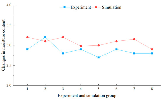To compare the variations in the water content of tiger nuts, 300 tiger nut seeds were used in each experiment, with their temperature measured and averaged. In the simulation experiment, 300 seeds were randomly selected to calculate the average value. The comparison between the experimental results and simulation results is shown in Figure 10. It can be seen that the water content of tiger nuts in each group decreased by about 3.0%; the simulation results are consistent with the experimental results and in accordance with the general law of drying [36]. The results show that the above CFD-DEM model can simulate the hot air drying of tiger nuts in the drying chamber of the drying tower.