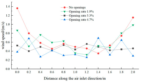 In order to further study the influence of the open corner box on the uniformity of the flow field in the drying chamber, the transverse distance of the fixed corner box is 320 mm, the longitudinal distance is 420 mm, and the wind speed at the inlet is 4 m/s. Moreover, 20 mm below the inlet corner box is selected as the measurement point, and the wind speed distribution trend is obtained, as shown in Figure 11. The average wind speed below the unopened corner box is 0.68 m/s, and the standard deviation is 0.58 m/s. The wind speed is higher near the air inlet and outlet and lower in the middle position, and the overall distribution of wind speed is not uniform. This is due to the higher wind pressure at the air inlet and outlet. In the open-hole corner tube flow, part of the gas can be released through the microporous sides of the side plate of the corner box, resulting in a significantly lower internal wind speed compared to the unopened-hole corner tube; this tends to stabilize the effect of wind distribution. The average wind speed under the corner box with 0.19% pore opening rate is 0.52 m/s, and the standard deviation is 0.43 m/s. This is because the pressure at the air inlet and outlet with a small pore opening rate is still larger than the pressure in the middle, the wind speeds at both ends are higher than that in the middle, and the wind speeds at both ends are lower. The average wind speed below the corner box with 4.7% openings is 0.41 m/s, and the standard deviation is 0.35 m/s. This is because more hot air flows into the side holes of the corner box, resulting in a significant reduction in wind speed and an increase in wind speed inhomogeneity. The advantage of the corner box with an opening rate of 0.33% is obvious, and the difference in wind speed along the inlet direction is small, with the average wind speed below the corner box being 0.47 m/s and the standard deviation being 0.12 m/s, which makes the wind field uniformity better. Therefore, it is preferable to adopt the corner box with an opening rate of 0.33% as the main ventilation structure in the drying room.