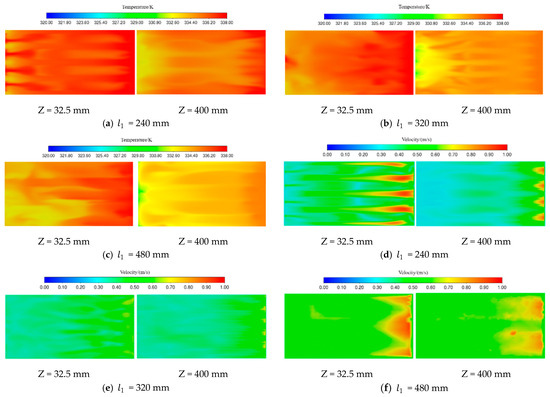 In Figure 12, the temperature and wind field distributions at different corner box horizontal spacings are displayed. The temperature and wind speed distributions in the figure are similar to those in references [11,31]. It can be seen that as the horizontal distance increases, the temperature and wind speed below the exit gradually decrease, and the temperature gradient and wind speed gradient change. When the horizontal spacing of the corner box is equal to 240 mm, the temperature field and wind field are not uniformly distributed. The wind speed is higher, and the temperature is higher near the exit direction. This is due to the high number of corner-mounted boxes, whose walls form a wall effect with the tiger nut seeds. The void ratio of tiger nut seeds on and near the walls of the corner boxes is always greater than that inside the drying bed. Because the resistance is relatively small, the fluid flow rate near the wall must be greater than inside the bed. The number of seeds is relatively small, and tiger nut seeds to the hot air lateral resistance is reduced. As a result, excessive wind speeds and temperatures are formed in some places. When the corner box spacing increases to 320 mm, the temperature and wind speed distributions at the two cross-sections are more uniform; the region basically realizes uniform wind distribution. In the air inlet corner of the box below, the temperature distribution is more uniform, meeting the requirements of the drying tower air temperature. When the spacing between the corner box is 480 mm, the temperature at the outlet and the temperature near the inlet has a certain gap, and the gradient of wind speed is larger in the two cross-sections. This is because the spacing between the two corner boxes is too large, and the tiger nut seeds have a greater lateral resistance to the hot air, resulting in a lower wind speed and temperature in the middle of the two corner boxes.
