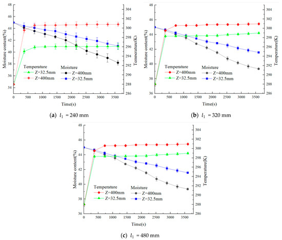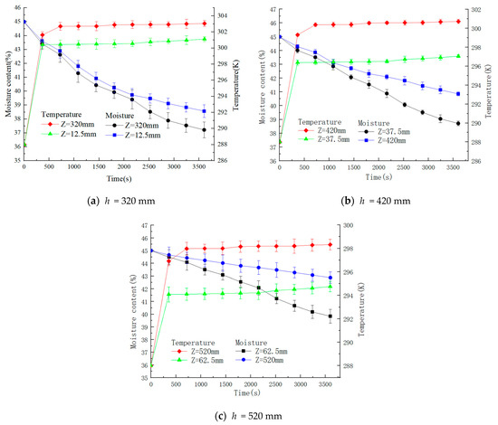 In order to further analyze the impact of the horizontal spacing of corner boxes on the heat conditions of particles, 100 tiger nut seeds are selected at cross-section Z = 320, Z = 12.5 mm; Z = 420, Z = 37.5 mm; Z = 520, Z = 62.5 mm, respectively, to find out the changes in temperature and moisture content over time; the results are shown in Figure 16. From the figure, it can be seen that with the increase in time, the temperature of the tiger nut first increases rapidly and then tends to stabilize, and the water content gradually decreases. With the increase in longitudinal distance, the gap between the temperature and moisture content of tiger nuts at two sections of the same vertical distance gradually increases. When the vertical distance between the corner boxes is equal to 320 mm, the final average temperature values of the tiger nuts are 305.14 K and 301.52 K, the extreme temperature and coefficient of variation are higher, and the average water content values are 36.4% and 38.7%. As the vertical spacing of corner boxes is equal to 420 mm, the final average temperatures of tiger nuts are 301.6 K and 296.4 K, and the average water content values are 39.6% and 41.3%. Overall, the temperature and moisture content distribution of tiger nuts in each region are basically the same. The average final temperatures of tiger nuts are 295.8 K and 292.9 K, and the average moisture content values are 39.5% and 42.3% when corner boxes are vertically spaced, equaling 520 mm. This is due to the large number of tiger nuts, and the distribution distance of the corner-mounted boxes is wide, making them unevenly heated. Therefore, it is better to choose a longitudinal spacing of corner boxes around 420 mm. This is because the increase in the thickness of the grain layer leads to an increase in airflow resistance and a decrease in the porosity between the tiger nuts. As a result, the airflow space inside the drying chamber decreases, leading to a decrease in air velocity. The water vapor evaporated from the surface of the tiger nut is taken away at a reduced rate, and the time required to reach equilibrium within the tiger nut grows, slowing down the drying rate.