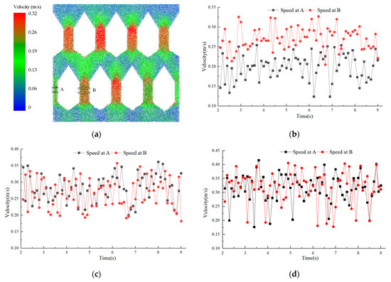 In order to investigate the effect of the lateral spacing of the corner-mounted box on the flow velocity of tiger nuts during grain discharge, the flow characteristics of tiger nuts are analyzed, as shown in Figure 14. As in Figure 14a, the flow velocities of tiger nut particles in contact with the corner box or the wall are comparatively lower than the flow velocities in other regions. The tiger nut flow velocities in the region between neighboring corner tubes are higher than those between the corner box and the inner wall, and there is a significant velocity difference between the particles. These effects were confirmed by flow experiments by K. L. Iroba and Jochen Mellmann et al. [37,38]. In order to assess the impact of different lateral distances of the corner box on the falling velocity of tiger nut particles, seed velocity monitors were set up at A, and B to monitor the vertical downward velocity of the seeds. As can be seen in Figure 14b–d, the seed falling velocity gradually accelerates with the increase in the lateral distance. When the lateral distance is equal to 240 mm, the average flow velocities at A and B are, respectively, 0.199 m/s and 0.271 m/s. The flow velocity of the tiger nuts on the side close to the inner wall of the drying chamber is significantly lower than that in the middle area of the two corner boxes. When the lateral distance is equal to 320 mm, the average flow rate values at A and B are 0.281 m/s and 0.267 m/s, respectively, and the flow rates of tiger nuts in the two areas are basically the same. When the lateral distance is equal to 480 mm, the average flow velocities at A and B are 0.314 m/s and 0.318 m/s. The difference in flow rates between the two regions is not significant, but there are large fluctuations in flow rates. By analyzing this, it can be seen that the shape of the tiger nut is irregular and the friction of the wall during the flow hinders the movement of the grains. If the residence time of the grain is less than the drying time, the grain will be under-dried. If the residence time of the grain is higher than the drying time, the grain will be over-dried. Increasing the transverse distance can, to a certain extent, prevent the thermal damage caused by localized overheating within the grains during the drying process, which can correspondingly improve the drying quality of tiger nuts. Therefore, it is best to choose a transverse distance of about 320 mm for corner boxes.