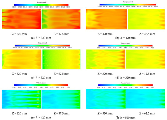 As shown in Figure 15, the temperature field and wind field distribution under different corner box vertical spacings are shown. When the vertical spacing of the corner box is equal to 320 mm, there is a significant difference in temperature in the same plane. In the horizontal direction, there is a laminar distribution, with the temperature on the exit side significantly higher than the import direction. If the vertical spacing of the corner box is equal to 520 mm, a drying dead zone is formed near the bottom of the air inlet, where the hot air temperature and wind speed are significantly lower than in other areas. When the vertical distance of the corner box is equal to 420 mm, the temperature difference between the two sections is small, and the hot air temperature is basically uniformly distributed. It can be seen that with the increase in the longitudinal distance, the gap between the average wind speeds of the two planes gradually becomes larger. This is because, due to the role of gravity, the closer to the bottom, the greater the static pressure between the tiger nut grain layer and the tiger nut particles. At this time, the denser accumulation of tiger nut particles results in a lower porosity of the tiger nut grain layer and a greater resistance to airflow; an increase in airflow resistance leads to a decrease in wind speed.