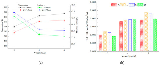 To study the impact of wind speed on the drying rate, 100 tiger nut seeds that were dried for 1 h were selected at cross-sections Z = 37.5 mm and Z = 320 mm, respectively, and the average values of temperature and moisture content were found, as shown in Figure 18a. From the figure, it can be seen that with the inlet wind speed increase, the final temperature and drying rate of the tiger nut gradually increase, and the moisture content gradually decreases. However, from 2 m/s to 4 m/s, when the temperature and moisture content of tiger nuts have greater changes, the drying rate obviously accelerates; 4 m/s to 6 m/s is when the temperature and moisture content of tiger nuts have little effect. When the wind speed is 2 m/s and 6 m/s, the temperature difference and moisture content difference between two sections of tiger nuts are larger, with a larger standard deviation, indicating that uniformity is poor. At 4 m/s, the uniformity is good.