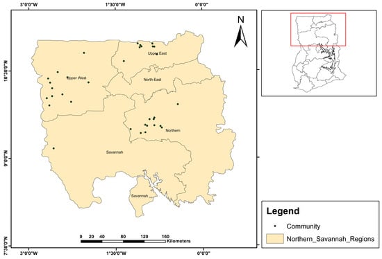 The study was conducted primarily in the Savannah agroecological zone that cuts across four administrative regions of Ghana (Figure 1), namely the Northern (11 communities), Upper East (9 communities), Upper West (13 communities), and Savannah Regions (1 community). These regions fall within latitude 8°0′0′′ N to 11°0′00′′ N and longitude 0°1′00′′ E to latitude 3°0′00′′ W (Figure 1).