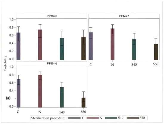 On the other hand, shoot growth was negatively affected by the highest dose of PPM (4 mL L−1) added to the growth medium when surface sterilization procedures C, S40, or S50 were applied (Figure 4).