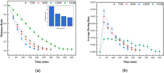 The drying characteristic curves under different ultrasonic powers can be seen in Figure 2 (The radiation temperature and ultrasonic frequency remain constant at 55 °C and 40 kHz). At ultrasonic powers of 72 W, 96 W, and 120 W, the required drying times for Cistanche slices were 300 min, 240 min, and 210 min. By observing the curves, it is evident that ultrasonic power has a significant influence on the drying process. This is because ultrasound causes high-frequency vibrations and turbulence inside Cistanche slices, reducing their ability to adsorb water and enhancing water mobility [29]. Additionally, the compression and expansion caused by ultrasound, known as the “sponge effect”, and the formation of micro-jets reduce the thickness of the heat and mass transfer boundary layer, improving the diffusion efficiency inside Cistanche slices and increasing the heat transfer rate [30]. As the ultrasonic power increases, the required drying time further decreases. This is because, with the increase in ultrasonic power, more ultrasonic energy is generated, enhancing the ultrasonic diffusion and mass transfer strengthening effect on water. Although increasing ultrasonic power can increase the drying rate, the strengthening effect of ultrasound weakens as the moisture content decreases. At the high moisture content stage, due to the high content of free water, ultrasound easily penetrates into the interior of Cistanche slices and propagates therein, which facilitates the propagation of ultrasound. However, as the internal moisture of the sample evaporates and the moisture content decreases, the effect of ultrasound weakens, resulting in a significant decrease in the enhancement effect on moisture diffusion and drying rate [31], manifested as a continuous decrease in drying rate.