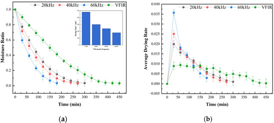 Effect of different ultrasonic frequencies on the drying characteristics of cistanche slices. (a) Moisture ratio variation curve, (b) Drying rate variation curve.