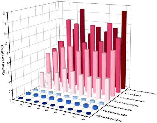 Phenylethanoid glycoside is one of the most researched types of active compounds in Cistanche currently. As a major active ingredient of Cistanche, it has positive effects such as antioxidation, liver protection, myocardial protection, neuron protection, and memory enhancement [50]. Iridoid is also one of the main chemical components of Cistanche, exhibiting antibacterial, anti-inflammatory, and analgesic effects [43]. The changes in Iridoid and Phenylethanoid glycoside components in Cistanche slices under different drying conditions can be seen in Figure 5. It can be observed that the content of Iridoid and Phenylethanoid glycosides in the dried products obtained by ultrasonic-assisted VFIR drying is higher than that of ND. The maximum contents of Catapol, Leonurusoside, Rhodioloside, Echinacoside, Poliumoside, Verbascoside and Isoacteoside increased by 47.84%, 47.47%, 37.06%, 34.62%, 24.2%, 26.43% and 32.49%, respectively, compared to ND. Except for slightly lower levels of Rhodioloside and Isoacteoside under certain conditions, the rest of the active ingredients in the dried products obtained from ultrasonic-assisted VFIR drying are higher than those in VFIR drying. Since these two types of components are extremely sensitive to light and heat, when the radiation temperature increases from 55 °C to 65 °C, the high-temperature environment causes severe damage to the cell materials. The content of Phenylethanoid glycosides such as Poliumoside, Isoacteoside, Leonurusoside, and Catalpol decreased by 11.43%, 13.1%, 32.12%, and 28.7%. The slight decrease in Verbascoside and Echinacoside content is mainly due to the high temperature damaging the hydrolytic enzymes, preventing the conversion of Echinacoside to Verbascoside [51,52]. Secondly, because Verbascoside and Isoacteoside are structural isomers, the increase in radiation temperature promotes the conversion of Isoacteoside to Verbascoside. When the ultrasonic power increased from 96 W to 120 W, the content of Poliumoside, Isoacteoside, Echinacoside, Leonurusoside, and Catalpol decreased by 11.12%, 8.5%, 17.38%, 27.29%, and 23.91%. This may be due to the excessive ultrasonic power and the resulting instantaneous high temperature, which destroyed the molecular structure, resulting in a decrease in content.