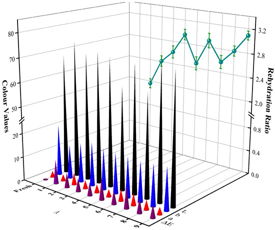 The RR is an important parameter for measuring the degree of tissue structure damage during the drying process. A higher value indicates less damage to the material’s tissue structure and higher integrity [55]. The variations of RR under different drying conditions can be seen in Figure 6. The maximum RR is 3.22, obtained under the conditions of 55 °C, 96 W, and 60 kHz. It can be observed that the RR under various conditions is higher than that of ND. This is because the vacuum conditions contribute to the generation of greater internal stress during the drying process, resulting in more pores in the material and enhancing its rehydration capability [56]. With the increase in radiation temperature and ultrasonic power, the RR shows a trend of first increasing and then decreasing. This is because high temperature and excessive ultrasonic power damage the structure of the material, causing surface cells to lose vitality and forming dense tissue, thereby increasing the resistance to internal water flow and reducing rehydration capability. With the increase in ultrasonic frequency, the RR shows an upward trend. In the study by Liu et al. [31] on ultrasound-assisted hot air drying of purple sweet potatoes, they also observed surface damage and collapse of the samples caused by ultrasound, leading to a decreased rehydration capacity. This may be because high-frequency ultrasound can induce stronger cavitation and mechanical effects, widening the pores and microchannels, thereby reducing the resistance to water transfer and enhancing rehydration capability [29].