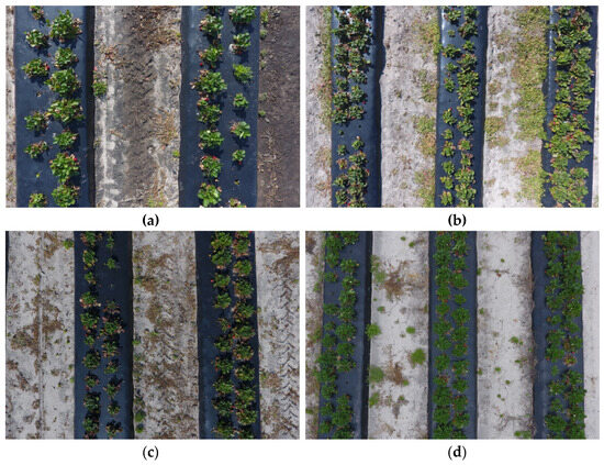 3000 pixels. When the drone captures images, the frontal overlap rate is 70% and the lateral overlap rate is 60%. All the flights were performed automatically by the DJI GroundStationPro (DJI Technology Co., Ltd., Shenzhen, China) iPad application, which is designed to conduct automated flight missions and manage the flight data of DJI drones. During each image capture, there are two flights conducted, capturing images from heights of 2 m and 3 m, respectively. The image capture at 2 m height takes 35 min per session, while the image capture at 3 m height takes 23 min per session. The initial images were divided into four types, and the example image is shown in