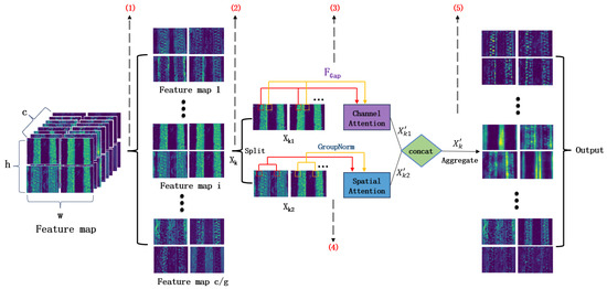 . The sub-features obtained from different groups were shuffled and merged to obtain the final output of the module. The calculation process of the fused features is shown in Equations (5) and (6).