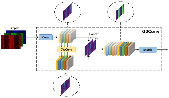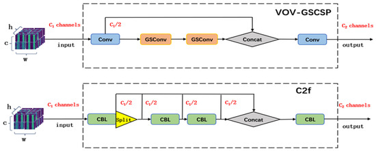 GSConv was used to build a lightweight VoV–GSCSP module, which replaced CBL blocks with lightweight convolutional GSConv based on the C2f module, and simplified the flow of channel information. Its detailed structure is shown in