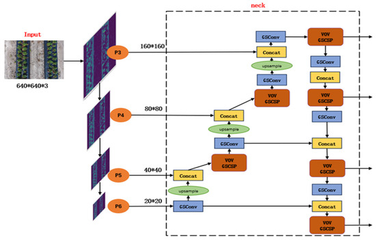 A small object detection layer added to the neck network was used to improve the resolution of the detection target, and the VoV–GSCSP module was used to reduce the size of the neck network. The neck network of the improved YOLOv8 model is shown in