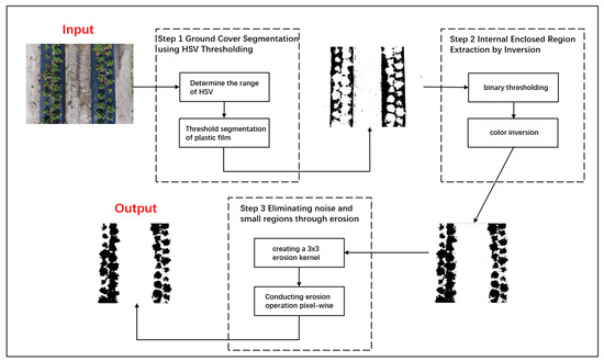 24]. This study indirectly obtained the strawberry plant area by segmenting the plastic film area with environmental stability. The segmentation process is shown in