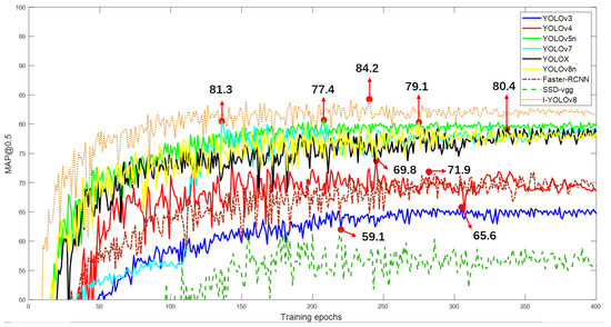 The map@0.5 value change of the improved YOLOv8 model compared to other models during the training process is shown in