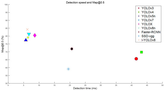 Figure 13. The detection speed of the improved YOLOv8 model was 6.2 ms, slightly higher than the YOLOv5n model’s 5.7 ms, but, however, faster than other models. The improved YOLOv8 model had the highest map@0.5 value. The detection speed could indirectly reflect the size of the model. The proposed model used the VOV–GSCSP module to optimize the C2f module in the neck part of the traditional YOLOv8 model. The module simplified the complexity of convolution operations and reduced model volume, while maintaining a high degree of accuracy.