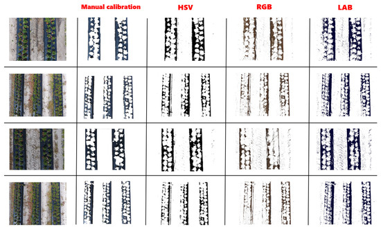 Figure 14, it can be seen that the threshold segmentation based on HSV accurately segmented the plastic film area, which was close to the manually calibrated area range. The threshold segmentation based on RGB did not have clear boundaries in the internal area of the plastic film, making it difficult to accurately segment the internal contours. While the threshold segmentation based on LAB could accurately segment the internal contour of the plastic film there were, however, many noise points in the image.