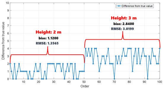 The bias of the error for the first set of images captured at a height of 2 m is 1.1200, and the rmse is 1.3565; The bias of the error for the second set of images captured at a height of 3 m is 2.8400, and the rmse is 3.0199; In the 100 images tested in the experiment, the estimated number of plants was generally lower than the actual number of plants.