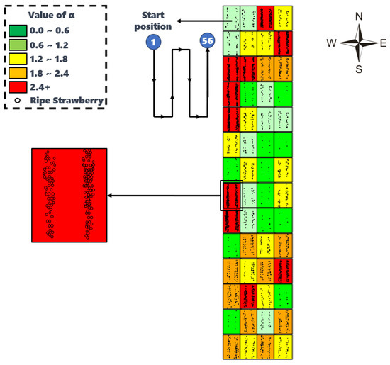 25]. If mature strawberries were not picked after maturity, they would begin to rot after 1–3 days. Weights were set based on the number of mature strawberries, immature strawberries, and strawberry flowers over time. The numbers of different plant objects were summed up, and divided by the number of strawberry plants. The result was defined as a strawberry growth parameter α. The size of this parameter could reflect the maturity of the region and the priority of picking. Based on the size of this parameter, different colors were used to draw regional growth maps, including strawberry growth parameters α. The calculation process is shown in Equation (14).