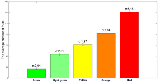 Figure 18, the average number of strawberry fruits representing colors green, light green, yellow, orange, and red, are 17.00, 43.70, 61.54, 82.10, and 121.2, respectively, showing an increasing trend in fruit quantity. The standard deviations within groups of different representative colors are 2.04, 2.01, 1.97, 2.64, and 5.18, respectively, indicating smaller variations within groups of the same representative color. The one-way ANOVA analysis conducted on the fruit quantity data for different colors yielded an F-ratio of 5.3067, which is less than 265.783 (α = 0.001), indicating a significant association between the representative color of the fruit and the quantity of fruits.