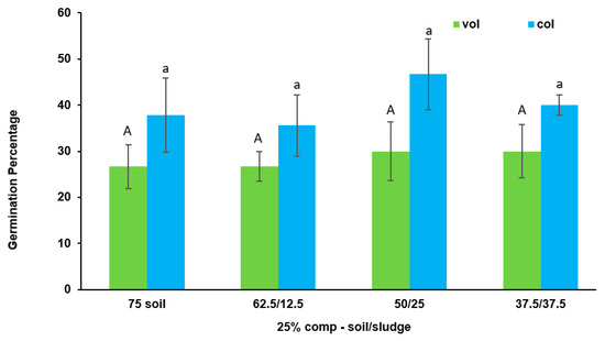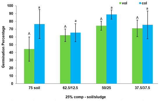Figure 2. Coriander seeds’ germination percentage in voladora and coloso soils amended with biosolids (compost and sludge); mixtures were made by %. Error bars represent standard error (n = 3). Different letters indicate significant differences with p-value < 0.05 according to Fisher’s exact test.