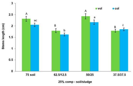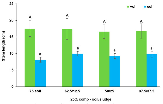 Figure 3. Basil stem length from plants cultivated in voladora and coloso soils amended with biosolids (compost and sludge); mixtures made by %. Error bars represent standard error (n = 30). Different letters indicate significant differences with p-value < 0.05 according to Fisher’s exact test.