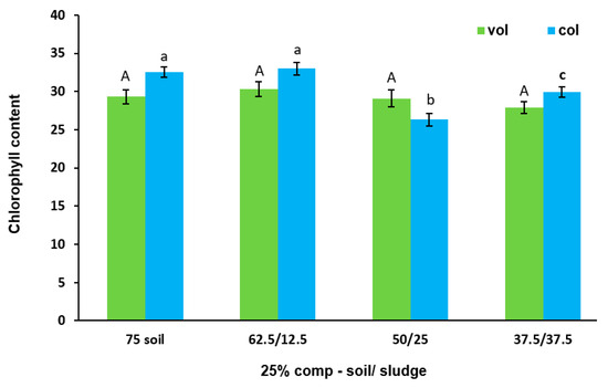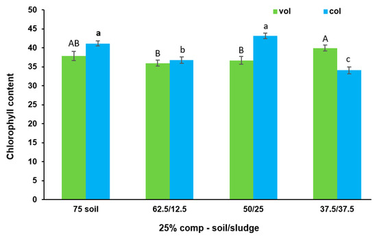 Figure 5. Total chlorophyll content in basil leaves cultivated in voladora and coloso soils amended with biosolids (compost and sludge); mixtures were made by %. Error bars represent standard error (n = 30). Different letters indicate significant differences with p-value < 0.05 according to Fisher’s exact test.