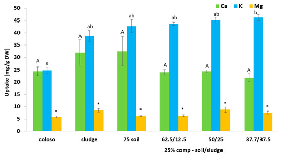 Figure 7. Ca, K, and Mg uptake in basil leaves cultivated in coloso soil and biosolids (compost and sludge); mixtures were made by %. Error bars represent standard error (n = 3). Different letters mean significant differences with p-value < 0.05 according to Fisher’s exact test. * means no significant differences between treatments.