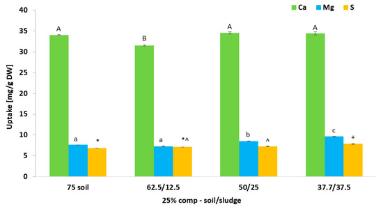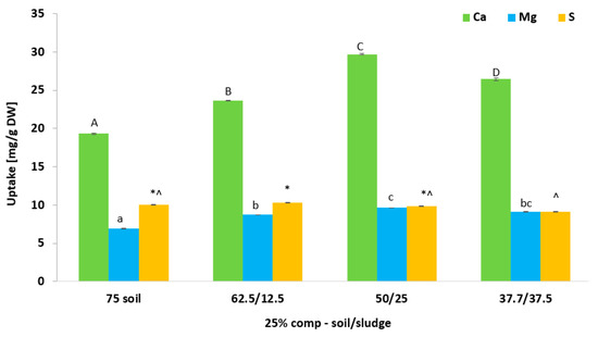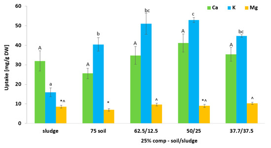 Figure 8. Ca, K, and Mg uptake in basil leaves cultivated in voladora soil and biosolids (compost and sludge); mixtures were made by %. Error bars represent standard error (n = 3). Different letters indicate significant differences with p-value < 0.05 according to Fisher’s exact test. Different symbols (* and ^) mean no significant differences between treatments.